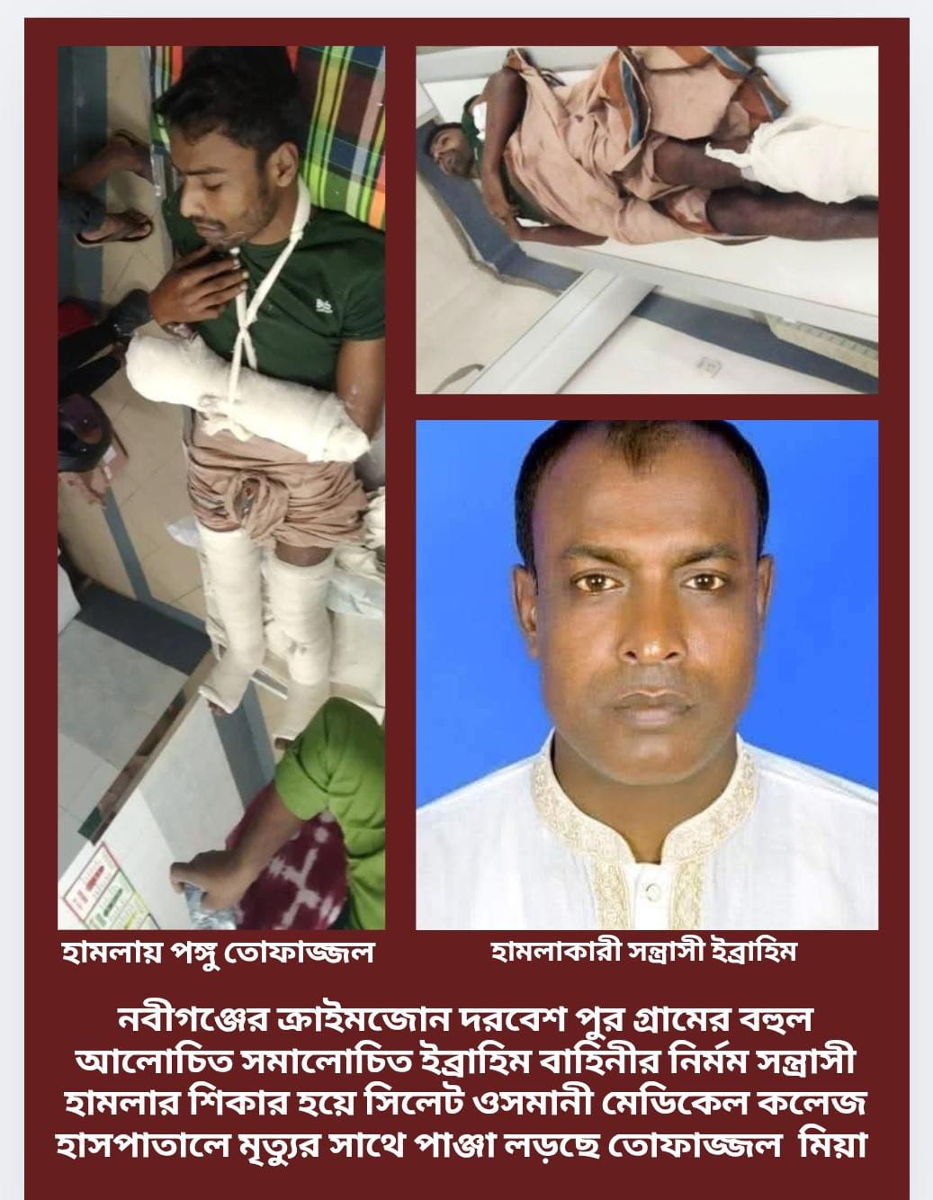 নবীগঞ্জে ইব্রাহিম বাহিনীর সন্ত্রাসী হামলায় দু’টি পা ও হাত হারিয়ে পঙ্গু তোফাজ্জল ওসমানীতে মৃত্যুর সাথে পাঞ্জা লড়ছে!