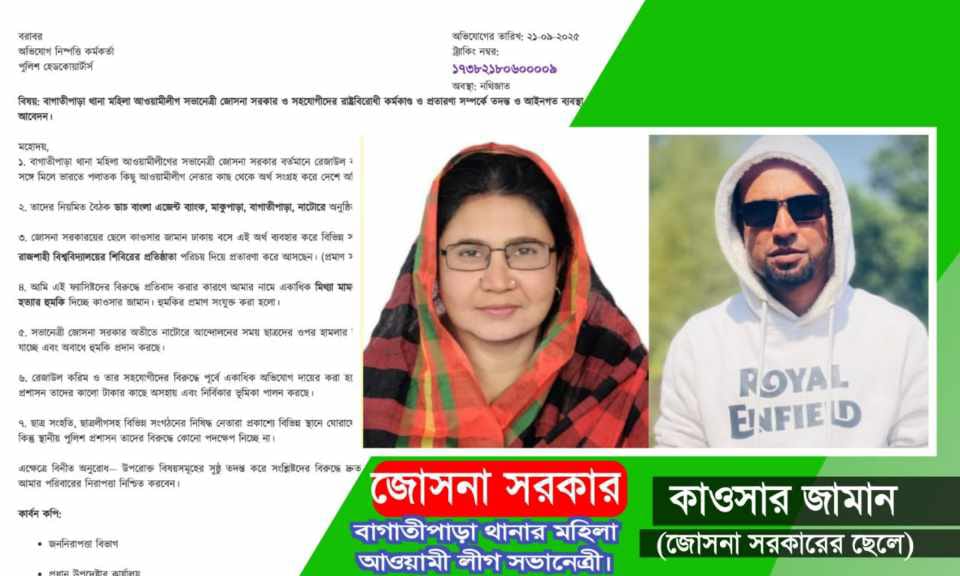 অভিযোগে আরও বলা হয়, অতীতে জোসনা সরকার বিভিন্ন ছাত্র আন্দোলনে সহিংসতা উসকে দিয়েছেন এবং তার ছেলে এখনও বিভিন্ন অপরাধে জড়িত রয়েছেন। রেজাউল করিম ও তার সহযোগীদের বিরুদ্ধেও আগেও একাধিক অভিযোগ দেওয়া হলেও স্থানীয় থানা থেকে কার্যকর ব্যবস্থা নেওয়া হয়নি বলে অভিযোগ রয়েছে।