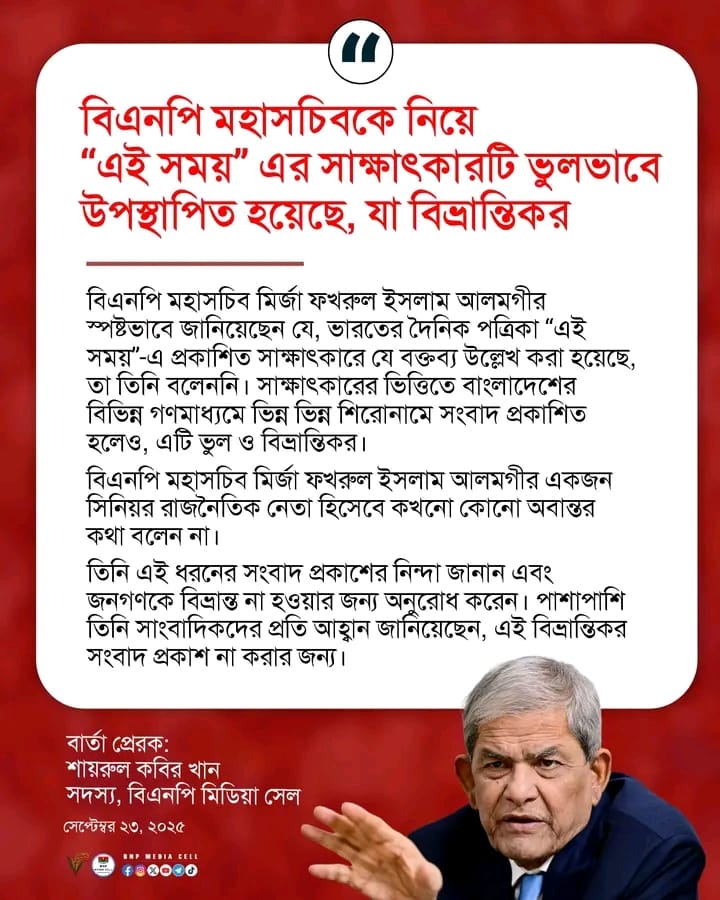 বিএনপি মহাসচিবকে নিয়ে “এই সময়” এর সাক্ষাৎকারটি ভুলভাবে উপস্থাপিত হয়েছে, যা বিভ্রান্তিকর।