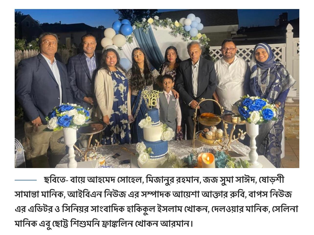 মুলধারার ক্লিনটন ডেমোক্রেটিক ক্লাবের সাধারণ সম্পাদক ও সাংকৃতিক দম্পতি দেলওয়ার মানিক ও সেলিনা মানিকের ষোড়শী তনয়া সামান্তা মানিকের 'সুইট সিক্সটিন' দিবস জাঁকজমকপূর্ণভাবে গত রবিবার, ২১ সেপ্টেম্বর ২০২৫, নিউইয়র্কের সাউথ জ্যামাইকায় তাদের বাসার পেছনের বিশাল বেকইয়ার্ডে পালিত হয়।খবর আইবিএননিউজ ।