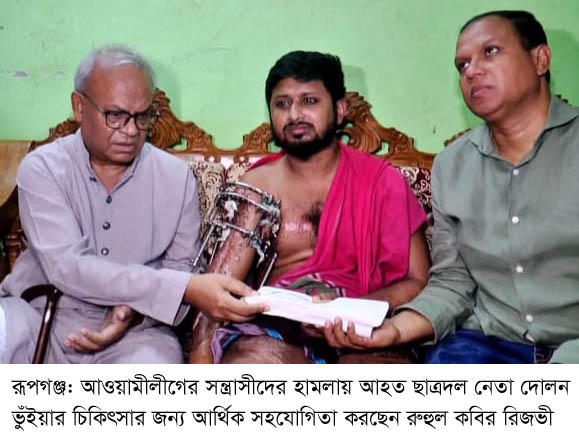 তিনি বলেন, আওয়ামীলীগের সন্ত্রাসীদের হামলায় গুরুতর আহত রূপগঞ্জ উপজেলা ছাত্রদল নেতা দোলন ভুঁইয়ার চিকিৎসার দায়িত্ব নিয়েছেন বাংলাদেশ জাতীয়তাবাদী দলের ভারপ্রাপ্ত চেয়ারম্যান তারেক রহমান। এ সময় তিনি তারেক রহমানের পক্ষ থেকে দোলনের চিকিৎসার জন্য আর্থিক সহায়তা তুলে দেন এবং তার চিকিৎসার খোঁজখবর নেন। ‘আমরা বিএনপি পরিবার’-এর একটি প্রতিনিধি দল দোলনের বাড়িতে আসেন। আহত ছাত্রদল নেতা দোলনের প্রতি তারেক রহমানের সহমর্মিতার বার্তা তাঁরা পৌঁছে দেন এবং সর্বাত্মক সহযোগিতার আশ্বাস দেন। প্রতিনিধি দলের নেতৃত্ব দেন বিএনপির সিনিয়র যুগ্ম-মহাসচিব ও সংগঠনটির প্রধান উপদেষ্টা অ্যাডভোকেট রুহুল কবির রিজভী।