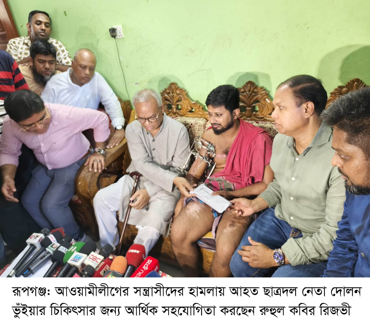 তিনি বলেন, আওয়ামীলীগের সন্ত্রাসীদের হামলায় গুরুতর আহত রূপগঞ্জ উপজেলা ছাত্রদল নেতা দোলন ভুঁইয়ার চিকিৎসার দায়িত্ব নিয়েছেন বাংলাদেশ জাতীয়তাবাদী দলের ভারপ্রাপ্ত চেয়ারম্যান তারেক রহমান। এ সময় তিনি তারেক রহমানের পক্ষ থেকে দোলনের চিকিৎসার জন্য আর্থিক সহায়তা তুলে দেন এবং তার চিকিৎসার খোঁজখবর নেন। ‘আমরা বিএনপি পরিবার’-এর একটি প্রতিনিধি দল দোলনের বাড়িতে আসেন। আহত ছাত্রদল নেতা দোলনের প্রতি তারেক রহমানের সহমর্মিতার বার্তা তাঁরা পৌঁছে দেন এবং সর্বাত্মক সহযোগিতার আশ্বাস দেন। প্রতিনিধি দলের নেতৃত্ব দেন বিএনপির সিনিয়র যুগ্ম-মহাসচিব ও সংগঠনটির প্রধান উপদেষ্টা অ্যাডভোকেট রুহুল কবির রিজভী।