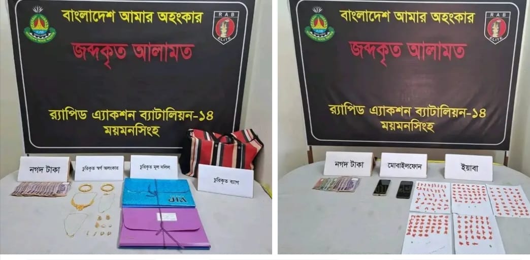 এরই প্রেক্ষিতে সদর কোম্পানী, র্যাব-১৪, ময়মনসিংহ এর একটি চৌকস দল গোয়েন্দা তথ্যের ভিত্তিতে ২৬ সেপ্টেম্বর ২০২৫খ্রিঃ সময় আনুমানিক রাত ২৩:০০ ঘটিকায় ময়মনসিংহ সদর থানার ডিবি রোড এলাকায় অভিযান পরিচালনা করে ঘটনায় জড়িত চোর ১। মোঃ বাবুল (৩২), পিতা-মোঃ আবুল কালাম, সাং-শেওড়া ধোপাখোলা এবং ২। রনি বনিক(৩৫), পিতা-প্রশন্ন বনিক, সাং-শেওড়া ডিবি রোড, উভয় থানা-কোতোয়ালী, জেলা-ময়মনসিং’দের গ্রেফতার করে। গ্রেফতারকৃত চোরদের দেয়া তথ্যের ভিত্তিতে চুরি যাওয়া ব্যাগসহ জমির মূল দলিলপত্র, পরিবারের ব্যবহৃত প্রায় ০৭ ভরি স্বর্ণালংকার এবং নগদ ১৭,০০০/-টাকা র্যাব-১৪, ময়মনসিংহ উদ্ধার করতে সক্ষম হয়।