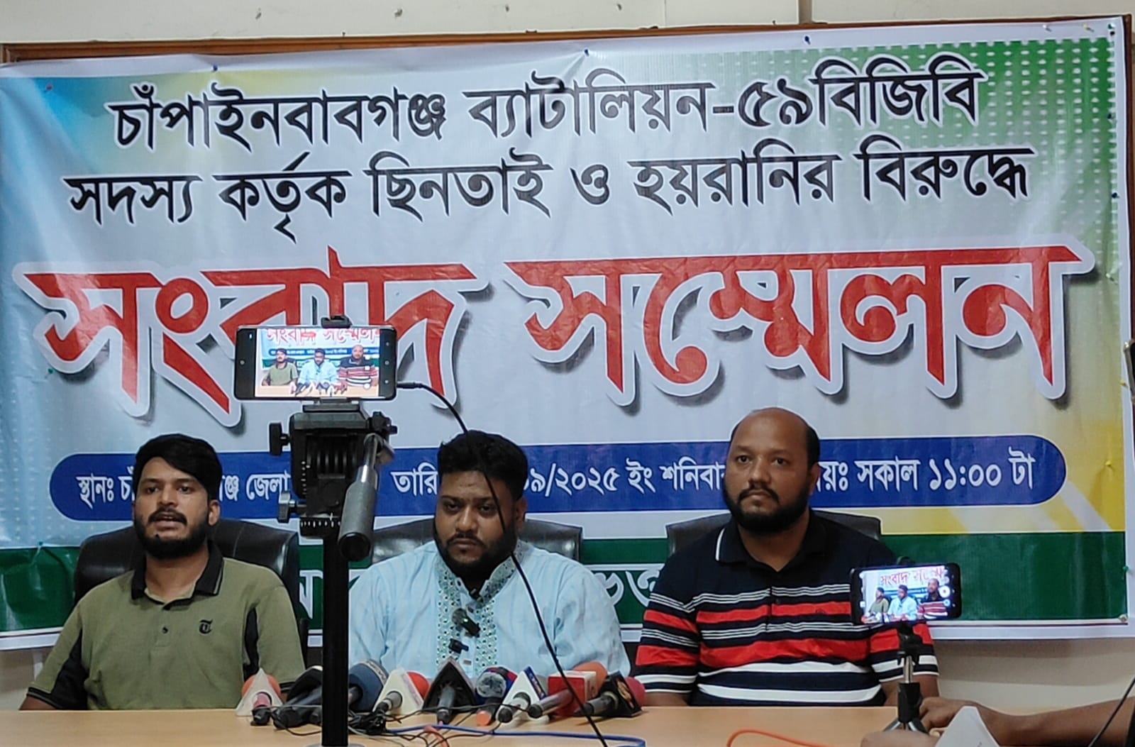 গণঅধিকার পরিষদ চাঁপাইনবাবগঞ্জ জেলা শাখার সাধারণ সম্পাদক আলমগীর কবির সিফতির ব্যাগ থেকে নগদ ৮ লাখ টাকা ও দুটি মোবাইল ফোন ছিনতাইয়ের অভিযোগ উঠেছে মহানন্দা ৫৯ বিজিবি ব্যাটলিয়নের ৪ সদস্যের বিরুদ্ধে। নগদ অর্থ ও মোবাইল ছিনতাইয়ের অভিযোগ তুলে সংবাদ সম্মেলন করেছেন গণঅধিকার পরিষদ নেতা আলমগীর কবির সিফতি। শনিবার দুপুরে চাঁপাইনবাবগঞ্জ জেলা প্রেসক্লাব মিলনায়তনে এই সংবাদ সম্মেলন করেন তিনি। এসময় ব্যাটলিয়ন ক্যাম্পে ওই নেতাকে ডেকে ভয়ভীতি ও মামলার হুমকি দেয়ার অভিযোগ উঠেছে।