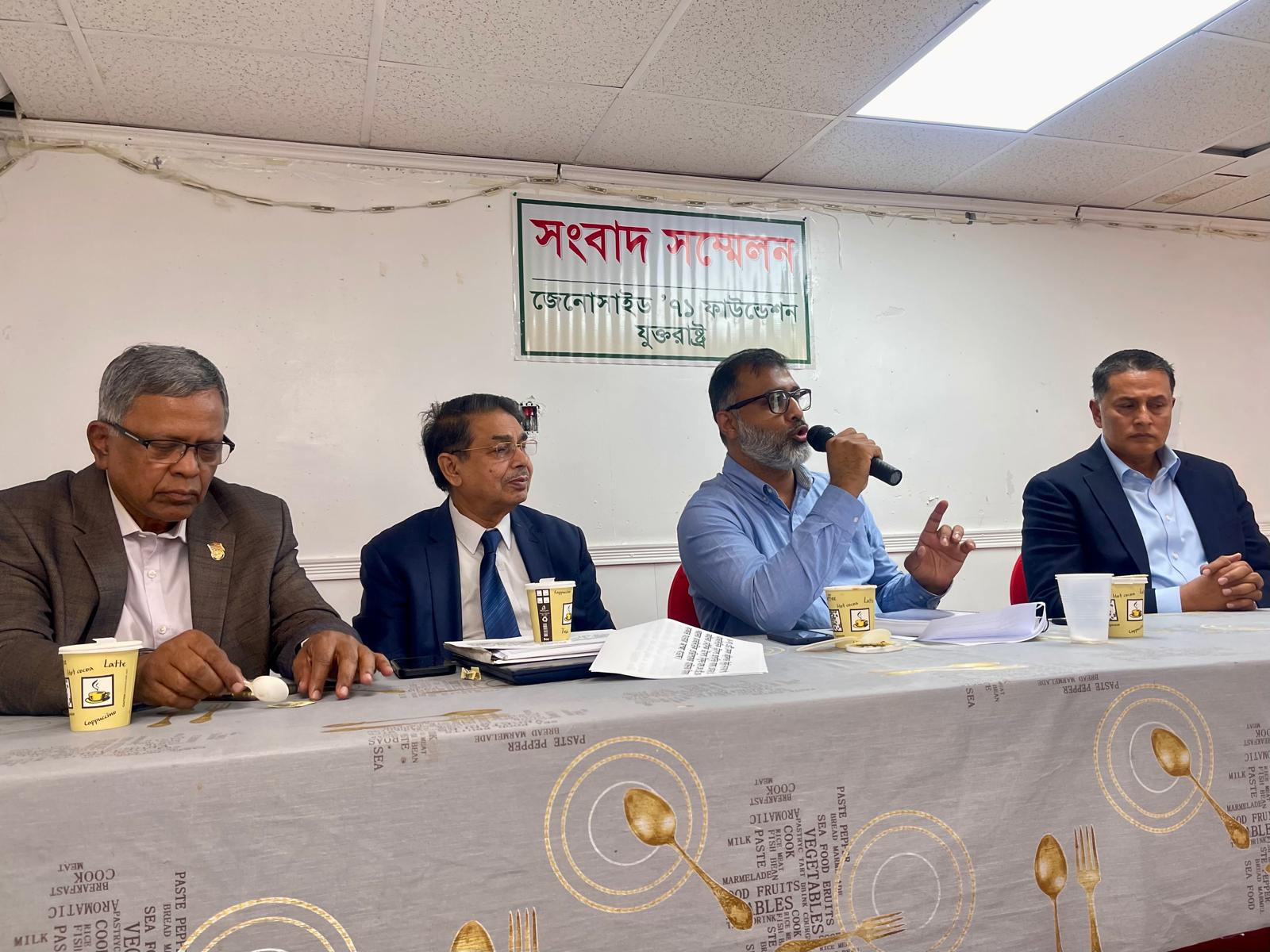 জেনোসাইড ‘৭১ ফাউন্ডেশন ইউএসএ সভাপতি ও যুক্তরাষ্ট্র আওয়ামী লীগের অন‍্যতম উপদেষ্টা এবং বীর মুক্তিযোদ্ধা ডঃ প্রদীপ রঞ্জন কর ।সংবাদ সম্মেলনে সূচনা বক্তব্য দেন যুক্তরাস্ট্র আওয়ামী লীগের আইন বিষয়ক সম্পাদক এডভোকেট শাহ মোঃবখতিয়ার। মঞ্চে উপস্থিত ছিলেন যুক্তরাষ্ট্র আওয়ামী লীগের দফতর সম্পাদক ইঞ্জিনিয়ার মোহাম্মদ আলী সিদ্দিকী এবং যুক্তরাষ্ট্র আওয়ামী লীগ পশ্চিম শাখার সভাপতি ডাঃরবি আলম।আরোও উপস্থিত ছিলেন যুক্তরাষ্ট্র আওয়ামী লীগের অন‍্যতম উপদেষ্টা ও সিনিয়র সাংবাদিক হাকিকুল ইসলাম খোকন,নিউইয়ক সিটি আওয়ামী লীগের সাধারন সমপাদক এমদাদুর রহমান চৌধুরী,যুক্তরাষ্ট্র মহিলা আওয়ামী লীগের যুগম সাধারন সমপাদক রুমানা আকতার,এডভোকেট মোঃআলী বাবুল,এডভোকেট জাকির এইচ মিয়া,এডভোকেট মুরশেদা জামান,আওয়ামী লীগনেতা টি.মোললাা,সাংবাদিক পলাস ননদী,ছাএলীগ নেতা রিদয় মিয়াসহ আরো অনেকে ।ইউনূসের সন্ত্রাস রুখে দিতে প্রবাসীদের দুর্বার ঐক্যের ডাক: জেনোসাইড ’৭১ ফাউন্ডেশন যুক্তরাষ্ট্রের সংবাদ সম্মেলনে বাংলাদেশকে জঙ্গিদের অভয়ারণ্য বানিয়ে পুনরায় ভিক্ষুক রাষ্ট্রে পরিণত করার গভীর ষড়যন্ত্রের বিরুদ্ধে প্রবাসীদের ঐক্যবদ্ধ হওয়ার আহ্বান জানানো হয়েছে যুক্তরাষ্ট্রের নিউইয়র্কে অনুষ্ঠিত জেনোসাইড ’৭১ ফাউন্ডেশন আয়োজিত সংবাদ সম্মেলনে।