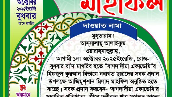 বাগদাদীয়া একাডেমির হিফজুল কুরআন বিভাগের ছাত্রদের সবক প্রদান উপলক্ষে মিলাদ মাহফিল ১ অক্টোবর ২০২৫ বুধবার বাদে মাগরিব নগরের ২ নং জয়নগরের বাগদাদীয়া একাডেমির হিফজুল কুরআন বিভাগের নবাগত ছাত্রদের সবক প্রদান ...বিস্তারিত পড়ুন