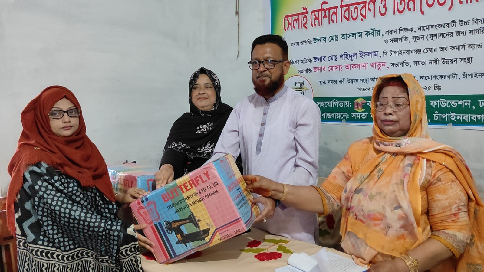 আজ (১ই অক্টোবর) বুধবার বিকাল ৪ ঘটিকায় সমতা নারী উন্নয়ন সংস্থার নিজস্ব অফিস হল রুমে এই সেলাই মেশিন বিতরণ করেন। উক্ত অনুষ্ঠানে সভাপতিত্ব করেন সমতা নারী উন্নয়ন সংস্থার সভানেত্রী মোসাঃ আকসানা খাতুন। অনুষ্ঠানে প্রধান অতিথি হিসেবে ছিলেন নামোশংকরবাটী উচ্চ বিদ্যালয়ের প্রধান শিক্ষক ও চাঁপাইনবাবগঞ্জ জেলা সুজনের সভাপতি মোঃ আসলাম কবির। বিশেষ অতিথি হিসেবে ছিলেন সিনিয়র সাংবাদিক কামাল সুকরানা, ধাইনগরে হ্যাভেন বুটিকের নারী উদ্দ্যোক্তা হোসনে আরা বেগম,চাঁপাইনবাবগঞ্জে নারী উদ্যোক্তা শামীমা বেগম।