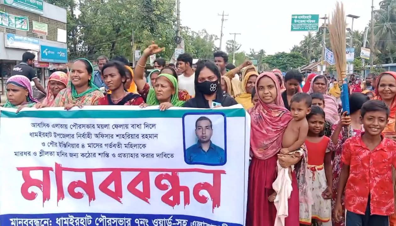 নওগাঁর ধামইরহাটে উপজেলা নির্বাহী কর্মকর্তা (ইউএনও) ও পৌরসভার প্রকৌশলীর বিরুদ্ধে গর্ভবতী নারীকে মারধর ও শ্লীলতাহানির অভিযোগে মানববন্ধন করেছে। অভিযুক্তদের অপসারণ ও শাস্তির দাবিতে বুধবার (১ অক্টোবর) দুপুরে উপজেলা চত্বরে ঘণ্টাব্যাপী এই কর্মসূচি পালিত হয়।