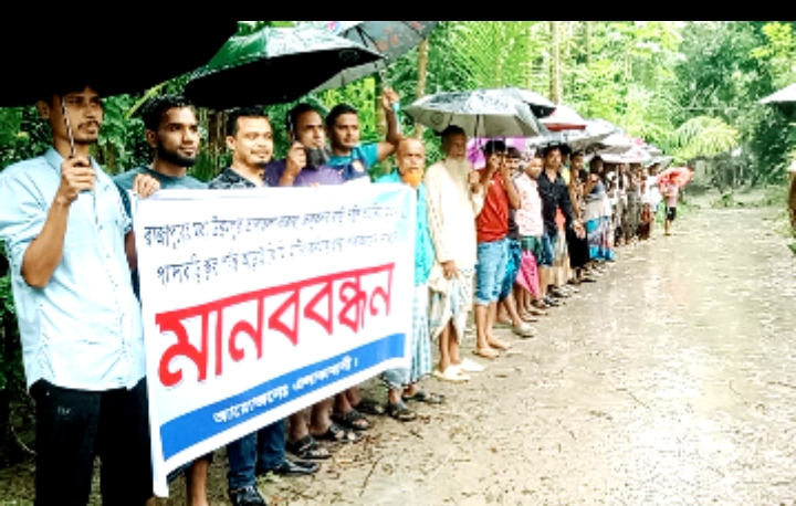 ০২ অক্টোবর-২০২৫ বৃহস্পতিবার সকাল ১০ ঘটিকার দিকে প্রচুর বৃষ্টি উপেক্ষা করে রাস্তাটি পাকা করার দাবীতে এ মানববন্ধনে অই এলাকার কোমলমতি শিক্ষার্থীরা সহ বিভিন্ন শ্রেণি-পেশার শতশত ভুক্তভোগীরা উপস্থিত ছিলেন। এ-সময় এলাকাবাসীর পক্ষে বক্তব্য রাখেন, সাইদুল মৃধা, সুমন মৃধা, বেল্লাল হোসেন, রাসেল মৃধা।