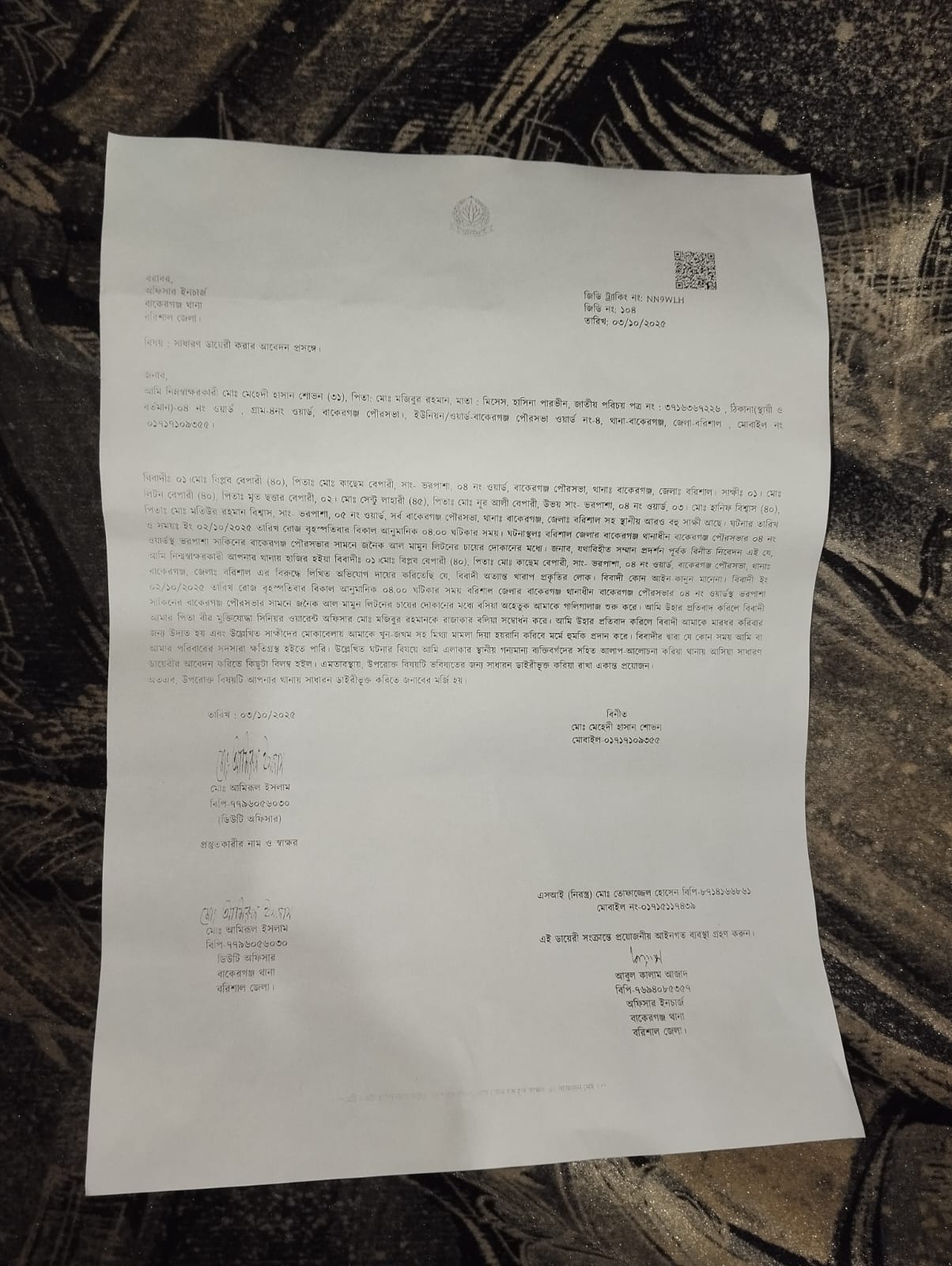 গত ২/১০/২৫ ইং তারিখে বিকাল চার ঘটিকায় পৌরসভার সামনে লিটন কমিশনারের চায়ের দোকানের ভিতর, বীর মুক্তিযোদ্ধা সিনিয়র ওয়ারেন্ট অফিসার মোঃ মজিবুর রহমানের ছেলে মোঃ মেহেদী হাসান শোভন কে ডেকে নিয়ে অকথ্য ভাষায় গালিগালাজ করে এবং তার বাবাকে রাজাকার বলিয়া সম্বোধন করে। এতে শোভন প্রতিবাদ করলে সে তাকে মারতে আসে স্থানীয় লোকের বাধায় তাকে মারতে না পেরে বলে “তোরে সন্ধ্যার পরে মারমু, তোরে পুলিশে ধরাইয়া দিমু”। এর প্রতিবাদে শোভন বলে “আপনি যা করার কইরেন এবং আপনি যদি আমার বাবাকে রাজাকার প্রমান করতে না পারেন তবে আমি আপনার বিরুদ্ধে আইনগত ব্যবস্থা নেবো”, এর পরিপ্রেক্ষিতে শোভন স্থানীয় গন্যমান্য ব্যক্তিদের পরামর্শ ক্রমে থানায় গিয়ে ৩/১০/২৫ ইং তারিখে জিডি করে। যাহার নাম্বার ১০৪।