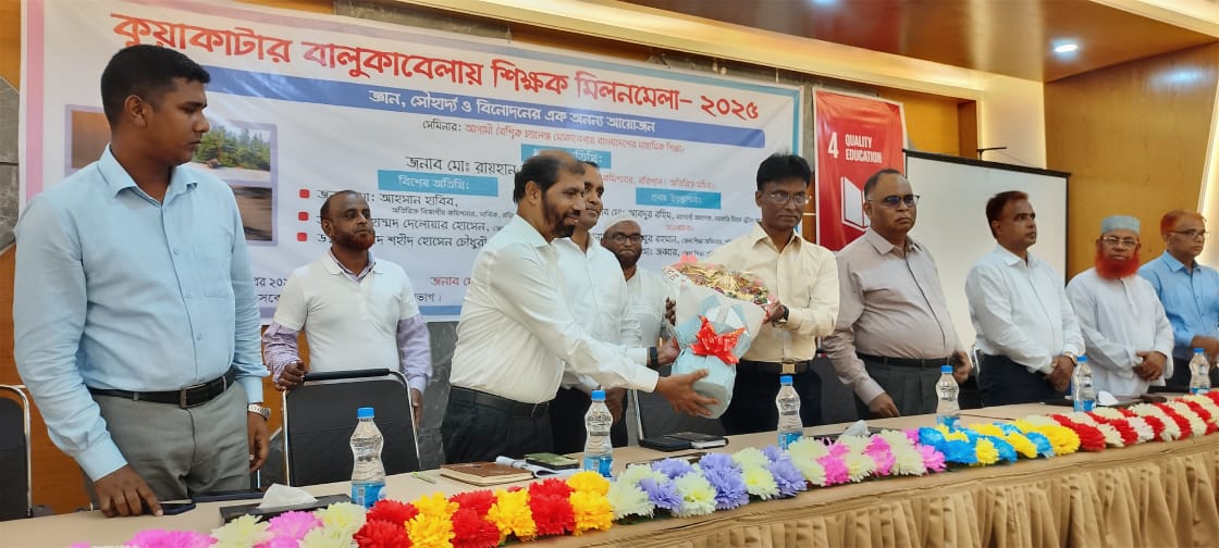 বালুকাবেলায় ২দিন ব্যাপী শিক্ষক মিলনমেলা- ২০২৫ অনুষ্ঠিত হয়েছে।শুক্রবার(১০ অক্টোবর) বিকাল ৫টায় কুয়াকাটার একটি অভিজাত হোটেলের সম্মেলন কক্ষে এ উপলক্ষে আগামী বৈশ্বিক চ্যালেঞ্জ মোকাবেলায় বাংলাদেশের মাধ্যমিক শিক্ষা বিষয়ক সেমিনার অনুষ্ঠিত হয়েছে।ডায়নামিক টিচার্স অব সেকেন্ডারি এডুকেশন, বরিশাল বিভাগ আয়োজিত সভায় সভাপতিত্ব করেন উপপরিচালক, মাধ্যমিক ও উচ্চ শিক্ষা, বরিশাল অঞ্চল, মোহাম্মদ জাহাঙ্গীর হোসাইন।
