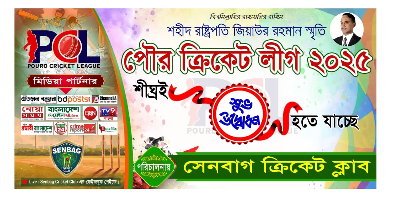 সেনবাগ উপজেলার সেরা খেলোয়াড়দের নিয়ে শীঘ্রই জমজমাট আয়োজনে উদ্বোধন হতে যাচ্ছে শহীদ রাষ্ট্রপতি জিয়াউর রহমান স্মৃতি “পৌর ক্রিকেট লীগ ২০২৫” ( PCL) । পুরো আয়োজনটির পেছনে রয়েছে সেনবাগ ক্রিকেট ক্লাব।