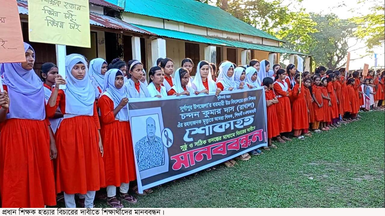 ঘন্টাব্যাপি মানববন্ধনে বক্তারা বলেন, আমরা এই মৃত্যু মেনে নিতে পারছিনা। গভীর উদ্বেগ প্রকাশ সহ ন্যায় বিচারের দাবীতে বারোমারী এলাকায় আমরা মানবন্ধন শুরু করেছি। এই মৃত্যু রহস্যজনক। প্রশাসন অনতিবিলম্বে যদি দোষিদের গ্রেফতার না করে, তাহলে পুরো উপজেলায় হরতাল দিবো। দুর্গাপুরের প্রানপ্রিয় প্রধান শিক্ষকের নির্যাতনে জড়িত ব্যক্তিদের খুঁজে বের করে, তদন্ত সাপেক্ষে তাদের বিরুদ্ধে আইনগত ব্যবস্থা অচিরেই নিতে হবে।
