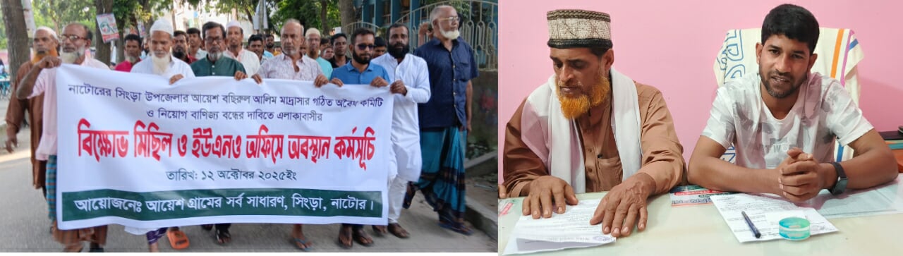নাটোরের সিংড়ায় কমিটি গঠনের সাধারণ নিয়মনীতি উপেক্ষা করে গোপনে পকেট কমিটি গঠন এবং সেই কমিটির মাধ্যমে নিয়োগ বাণিজ্যের অভিযোগ এনে বিক্ষোভ মিছিলসহ ইউএনও অফিস চত্বরে অবস্থান কর্মসূচি পালন করেছে আয়েশ বছিরুল আলিম মাদ্রাসার অভিভাবক সদস্য ও স্থানীয় জনসাধারণ।