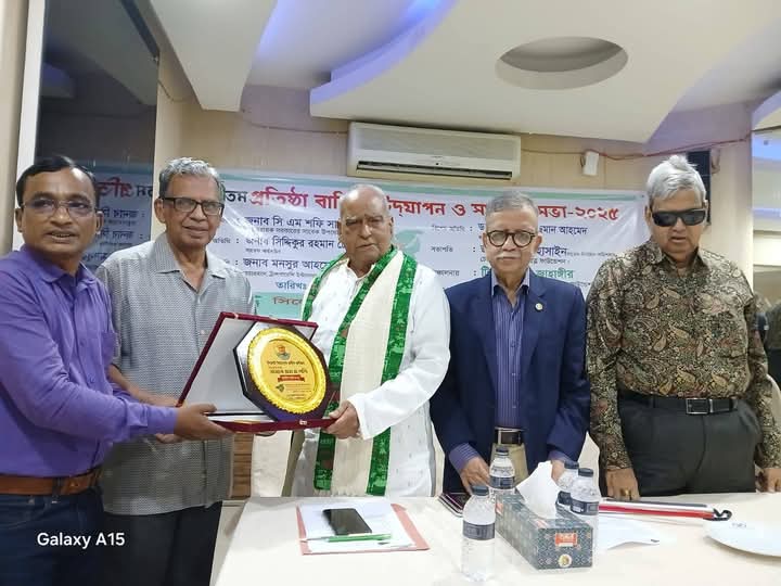 The chief guest of the program, Mr. CM Shafi Sami, gave a crest to the welcome guest. Mr. M. A. Gani is dressing the North as Siam and Upma of the current generation of Sylhet Ratna Foundation. Photo: October 17-2025, Gulshan North Club, Dhaka.