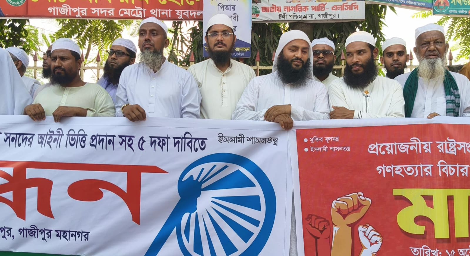 Islami Andolan Bangladesh Gazipur metropolis is doing human chain for 5 point demands including implementation of July charter and peer system elections.