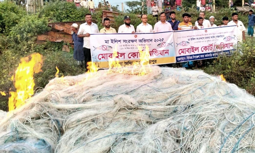 Its market value is 40 lakh rupees. Also 80 kg of hilsa fish was seized. The caught fish are distributed among the three local Madrasahs. And 200,000 meters of electricity nets seized in public were set ablaze. According to the sources of the Department of Fisheries, there are 55,000 card holders among the registered fishermen in the district.Number 44167 so far. Since October 4, 132 raids have been conducted and 32 mobile coats have been conducted. Fish seized was 845 kg and net seized was 7 lakh meters with an estimated value of Rs 113 lakh. Up to 13 cases were filed and 6 fishermen were sent to jail, also fined 90 thousand taka. District Fisheries Officer Aminul Islam as well as Assistant Commissioner Bhumi Abhi Dash mobile court1 fisherman was fined Tk 2,000 by handling, Laxmipur Sadar Senior Upazila Fisheries Officer Mr. Mahmudul Islam Chowdhury and Naval Police were also present in the operation of the mobile coat. District Fisheries Officer Aminul Islam said that the campaign to protect mother hilsa will continue.