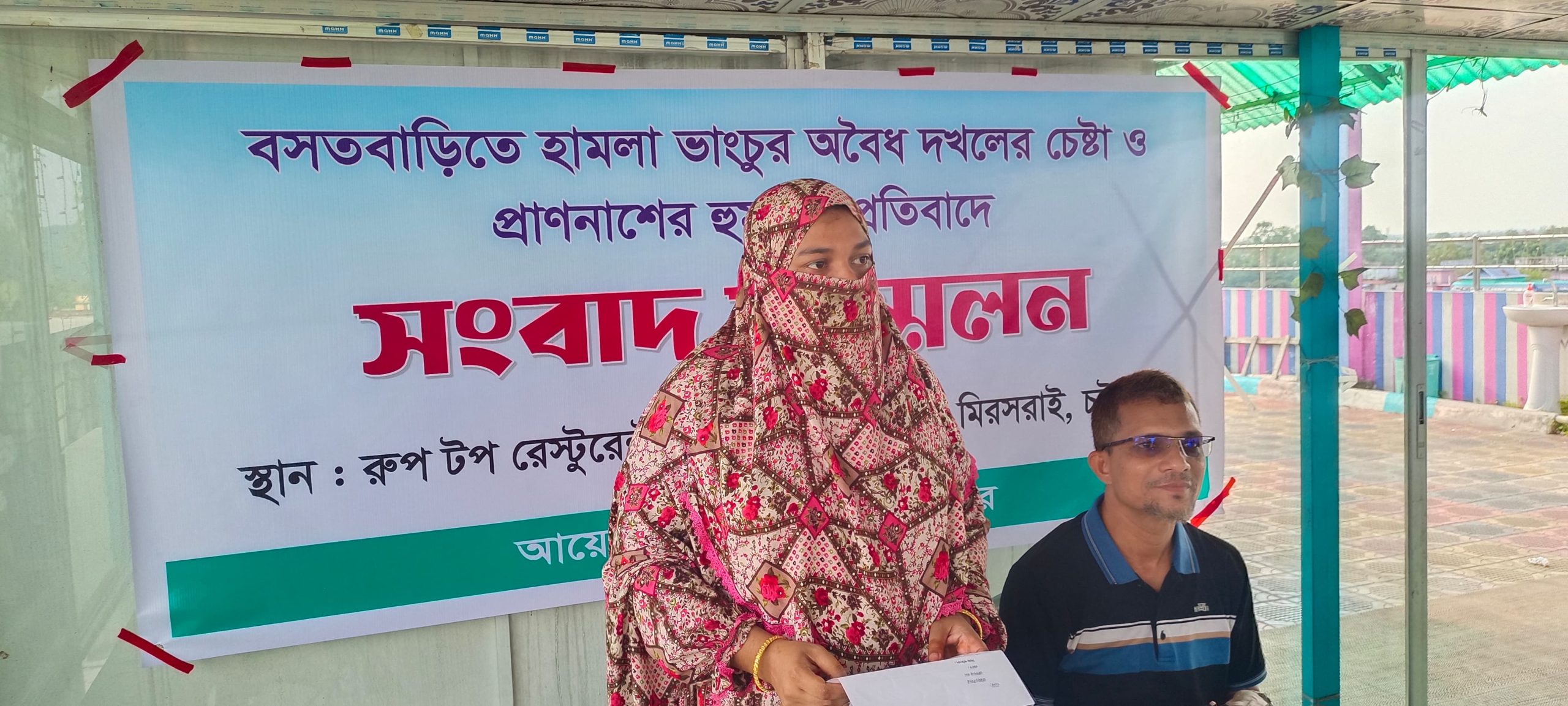 The victim woman held a press conference to protest against the forced occupation of her house in Mirsarai, Chittagong by illegally entering the house, measuring and constructing it. The press conference was held at a local restaurant on Saturday 18 October afternoon. Meanwhile, the victim Sabrin Tahchina said, Mehdi Nagar of East Hinguli Union under Zorarganj police station.Local people Redwanul Haque Sohag and Azam Khan entered the house by climbing the boundary wall of the house last Thursday afternoon, measuring the land of the house and digging the pole to get the land with unknown people. Protesters are subjected to verbal abuse and beatings and death threats. He demanded justice from the administration for the recovery and security of the land from these illegal occupants. He also said that they are the placeHe complained to Baryarhat Municipality that he would get it. They tried to forcibly occupy the land before the grievances were settled. A written complaint has been given to Zorarganj police station seeking justice for the incident. Sabreen Tahsina’s husband Kazi Zaker at the press conference. Meanwhile, when asked about the complaint, Azam Khan said, “We went to measure so that we can get a place.” No one was threatened.