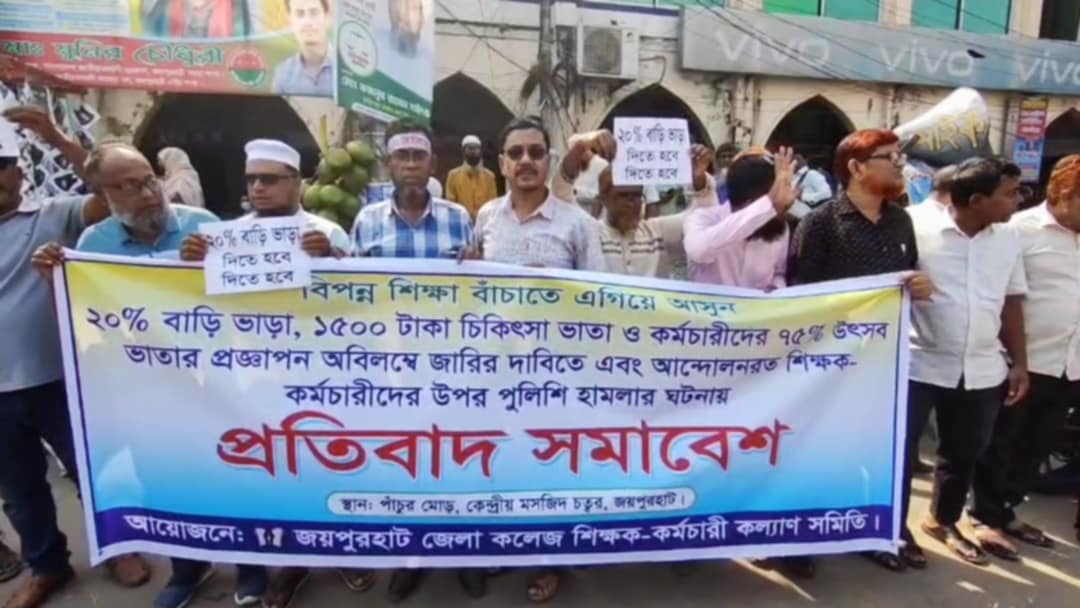 The District College Teachers’ Welfare Association held a human chain and protest rally in Joypurhat to demand immediate issuance of notification of 20% housing allowance, Tk 1,500 medical allowance and 75% allowance of employees and to protest against the police attack on the agitating teachers and employees.