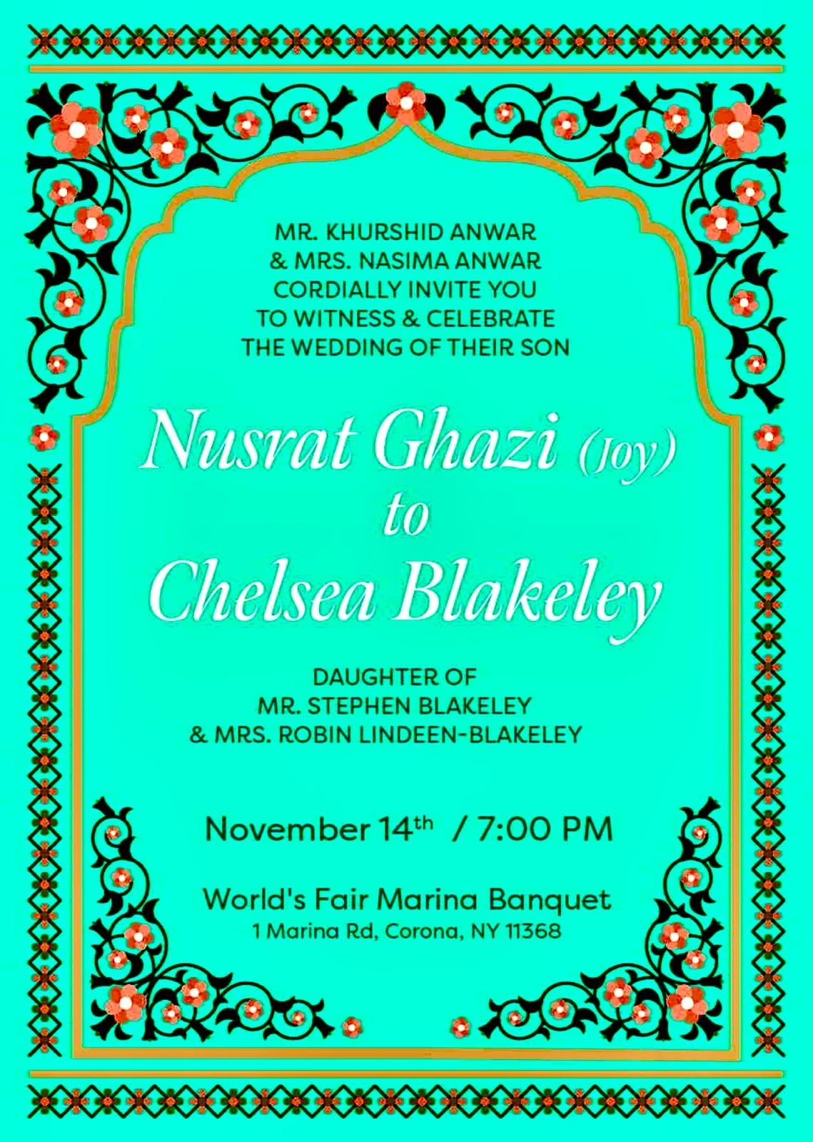 Pilot and engineer Nusrat Ghazi Joy, the only daughter of brave freedom fighter, columnist and journalist Khurshid Anwar Bablu and Nasima Anwar Bablu and Chelsea Blakely, daughter of Stephen Blakely Corbett and Robin Landen Blakely of Muldhara, USA, will be celebrated on Friday, 14 November 2025.7 pm at Historic World Fair Marina Venquot Party Hall, 1 Marina Road, Corona, New York, NY-11368. Note, Engineer Nusrat Ghazi Joy is working as an American pilot in Seattle, the capital of Washington state and Chelsea Blakely is working as an American school teacher in Seattle. Changes. In the said event, various political, social,IBN News has been informed by the organizers that cultural, artists, writers, journalists, freedom fighters and prominent people of the community will participate as guests.