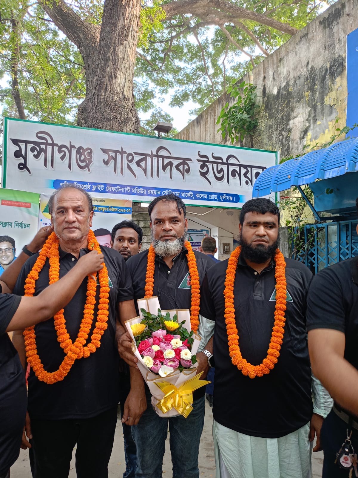 Other journalists welcomed the president and general secretary with flower garlands. Later, the newly-elected winning executive committee is the president of Mungiganj Press Club, former general secretary. Abu Saeed exchanged greetings with Sohan and other journalists of the Press Club.