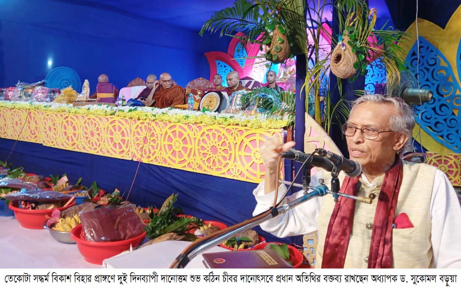 On the concluding day of the two-day program last Saturday, October 25, at the premises of Tekota Saddharma Vikas Vihar under Patia upazila, the Principal of Jaishtapura Shakyamuni Vihar, Bhadanta Jinananda Mahasthbir, presided over the Chief Dharma Desh.Bhadanta U Panya Tilak Mahathero of Bandarban Swarnjadi was Bhadanta Subhananda Mahathero, Inaugural address was given by Bhadanta Saran Sen Mahathero, Principal of Tekota Saddharma Bikas Vihar, Bihar Governing Council President Bikas Barua gave the welcome address and General Secretary Kamnashish Barua, Senior Vice President Subir Barua, Vice President Subhashis Barua gave the welcome address. Vice President Sarit Chowdhury, a brave freedom fighterDevapriya Barua Jhulan, Professor Arup Barua. Religious editor Satyapriya Barua prayed Panchsheel. Joint General Secretary Pranab Barua expressed gratitude. The overall program was hosted by co-editor Shiplu Barua and music artist Rubel Barua.
