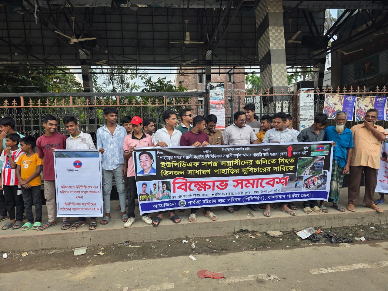 A protest rally was held by Chittagong Chittagong Chhatra Parishad (PCCP) Bandarban district branch in front of Shaheed Abu Saeed Mukta Manch in the city on Wednesday afternoon (October 29) demanding justice for the killing of three ordinary hill youths who were shot dead by armed terrorists of UPDF.