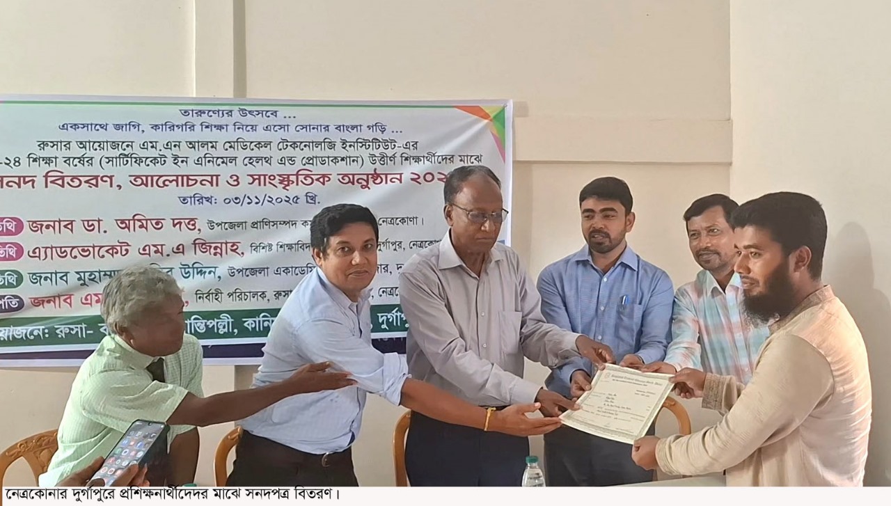 One year course “Certificate in Animal Health and Production” organized by Non-Governmental Development Organization “RUSA Bangladesh” under Bangladesh Technical Education Board at Durgapur, Netrokona has been completed. Their certificates were distributed on Monday (November 03) afternoon.