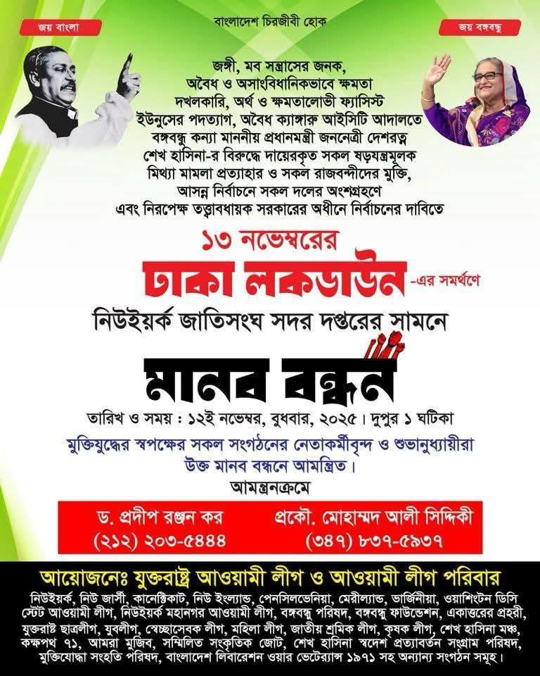 In support of the Dhaka lockdown on November 13, on Wednesday, November 12, the United States Awami League, Awami family, all allied organizations, and various political, social, cultural, human rights, professional and legal organizations for the liberation war, on Wednesday, November 12, at 1 p.m. in front of the United Nations headquarters in New York at 47 StIllegal teacher in 1 episode.Demonstrations and protest rallies will be held to demand the resignation of the Mohammad Yunus government, the withdrawal of various false cases including ICT against the leaders and activists of the liberation war including Awami League president and former five-time prime minister Sheikh Hasina and the election of the national parliament under the caretaker governmentThe organizers cordially invited all expatriates to participate.
