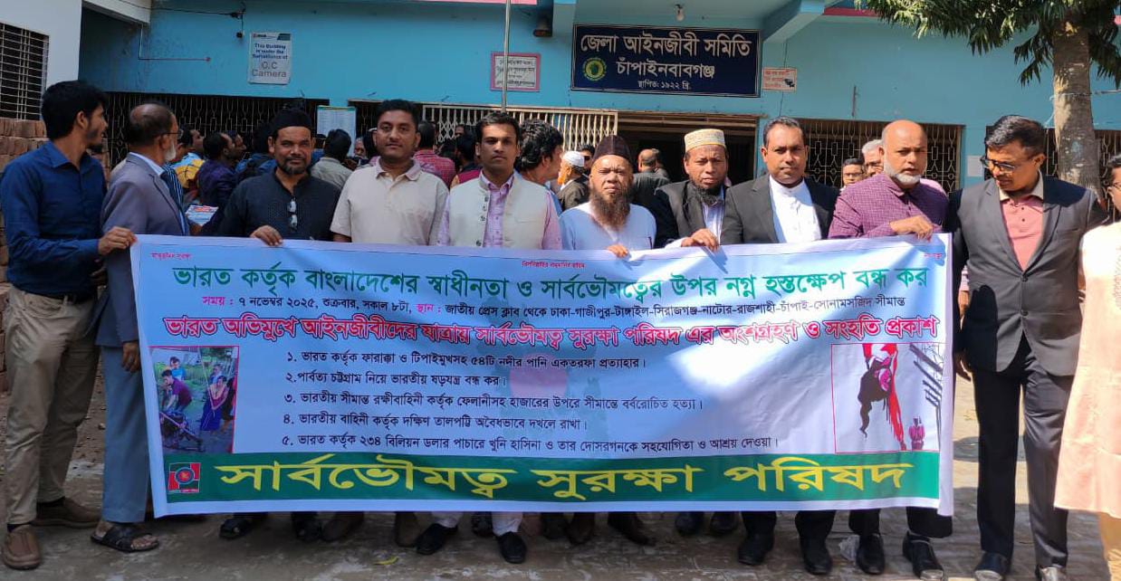 Md. Mostafa Al Ihaz, chief coordinator of the Sovereignty Protection Council, warned of a tough response to the Indian conspiracy on the Chittagong Hill Tracts from the long march of “Voice of Lawyers Bangladesh” in front of the Nawabganj Government College in Chapainbayabganj on November 8.