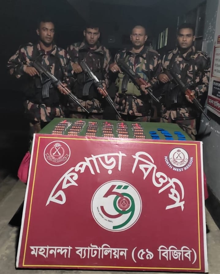 Members of Chapainawabganj Mahananda Battalion (59 BGB) are always performing their duty at the border. In continuation of this, on November 11, 2025 at approximately 06:30 in the evening, 01 special patrol team of Chakpara BOP of Mahananda Battalion (59 BGB) approximately 20 yards from border pillar 182/4-S, Shibganj of Chapainawabganj district inside Bangladesh.Under the Thana conducted an operation in an area called 19 Bigha of Upchakpara village of Shahabajpur Union. In the said operation, the patrol team was able to seize a large quantity of narcotic tablets (Yaba-1940 pieces and Tapentadol tablets-3600 pieces) without owners. During the raid, the smugglers sensed the presence of the BGB and fled from the spot. Presently, the seized narcotic tablets were handed over to Shibganj police stationhas