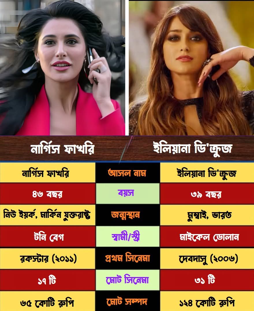 বলিউডের আধুনিক পর্দায় নার্গিস ফাকরি এবং ইলিয়ানা ডি’ক্রুজ—এই দুই অভিনেত্রী তাঁদের আকর্ষণীয় চেহারা ও স্বতন্ত্র অভিনয়শৈলীর কারণে দর্শকদের মাঝে বিশেষ জনপ্রিয়তা লাভ করেছেন। তাঁরা দু’জনেই ভিন্ন পটভূমি থেকে এসে নিজেদের জন্য একটি সফল বাণিজ্যিক স্থান তৈরি করেছেন।