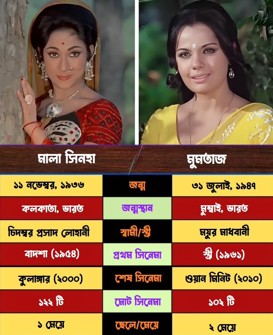 বলিউডের পঞ্চাশ ও ষাটের দশকের চলচ্চিত্রকে যাঁরা তাঁদের অভিনয় দক্ষতা এবং জনপ্রিয়তা দিয়ে উজ্জ্বল করে রেখেছিলেন, তাঁদের মধ্যে মালা সিনহা এবং মুমতাজ হলেন দুই উল্লেখযোগ্য তারকা। এই দুই অভিনেত্রী তাঁদের স্বতন্ত্র স্টাইল এবং কর্মজীবনের ভিন্ন পথ দিয়ে হিন্দি সিনেমার ইতিহাসে নিজেদের স্থান পাকা করে নিয়েছেন।