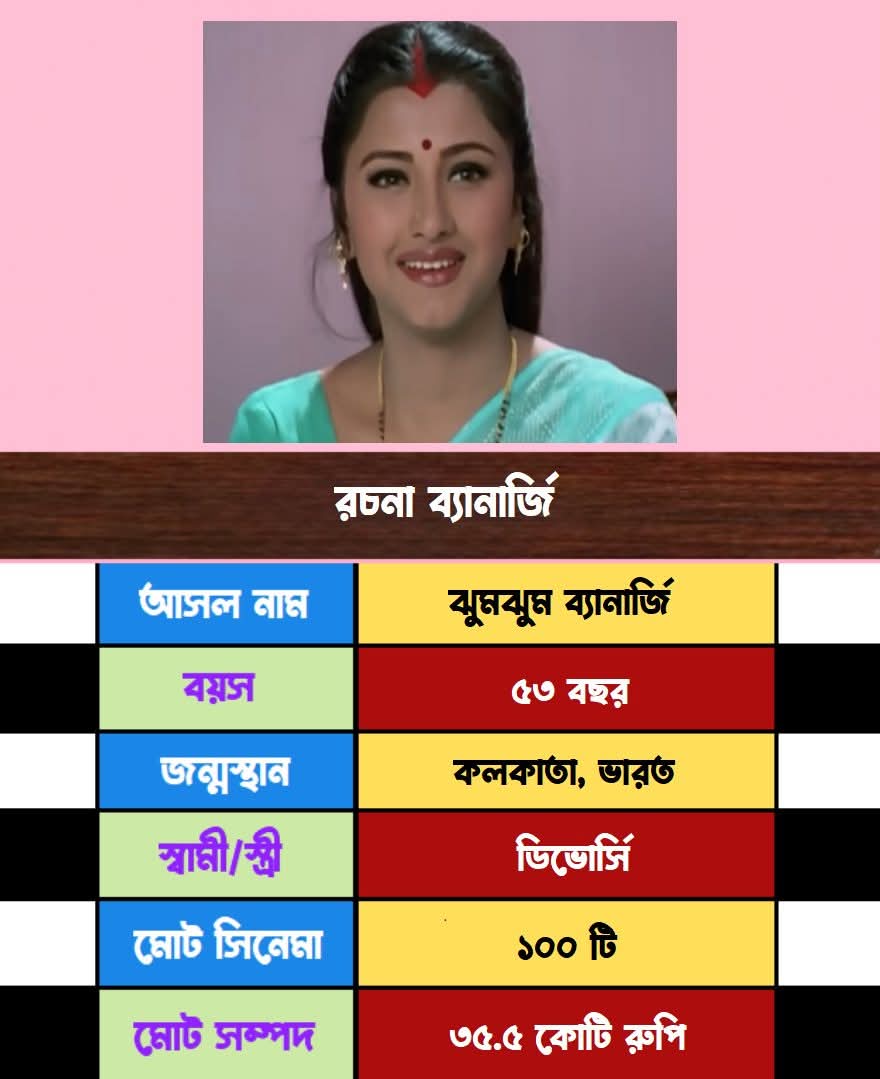 ভারতীয় চলচ্চিত্র ও টেলিভিশন জগতে রচনা ব্যানার্জি এমন একটি নাম, যিনি যুগের পর যুগ ধরে তাঁর কমনীয়তা ও প্রাণবন্ততা দিয়ে দর্শকদের মুগ্ধ করে চলেছেন। তাঁর আসল নাম ঝুমঝুম ব্যানার্জি, যাঁর জন্মস্থান আমাদের প্রাণের শহর কলকাতা-য়। আজ ৫৩ বছর বয়সেও তাঁর অনবদ্য উপস্থিতি এবং কাজের প্রতি তাঁর নিষ্ঠা নতুন প্রজন্মের শিল্পীদের কাছে এক অনুপ্রেরণা।
