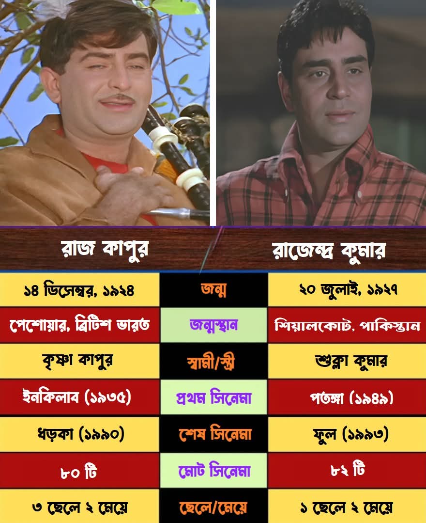 বলিউডের পঞ্চাশ ও ষাটের দশক, যা হিন্দি সিনেমার স্বর্ণযুগ নামে পরিচিত, সেই সময়টিকে নিজেদের অভিনয় দক্ষতা ও জনপ্রিয়তা দিয়ে উজ্জ্বল করে রেখেছিলেন রাজ কাপুর এবং রাজেন্দ্র কুমার। যদিও দু’জনের জনপ্রিয়তার ধরণ ছিল ভিন্ন, তবুও তাঁরা দর্শকদের হৃদয়ে স্থায়ী আসন গড়ে নিয়েছিলেন।