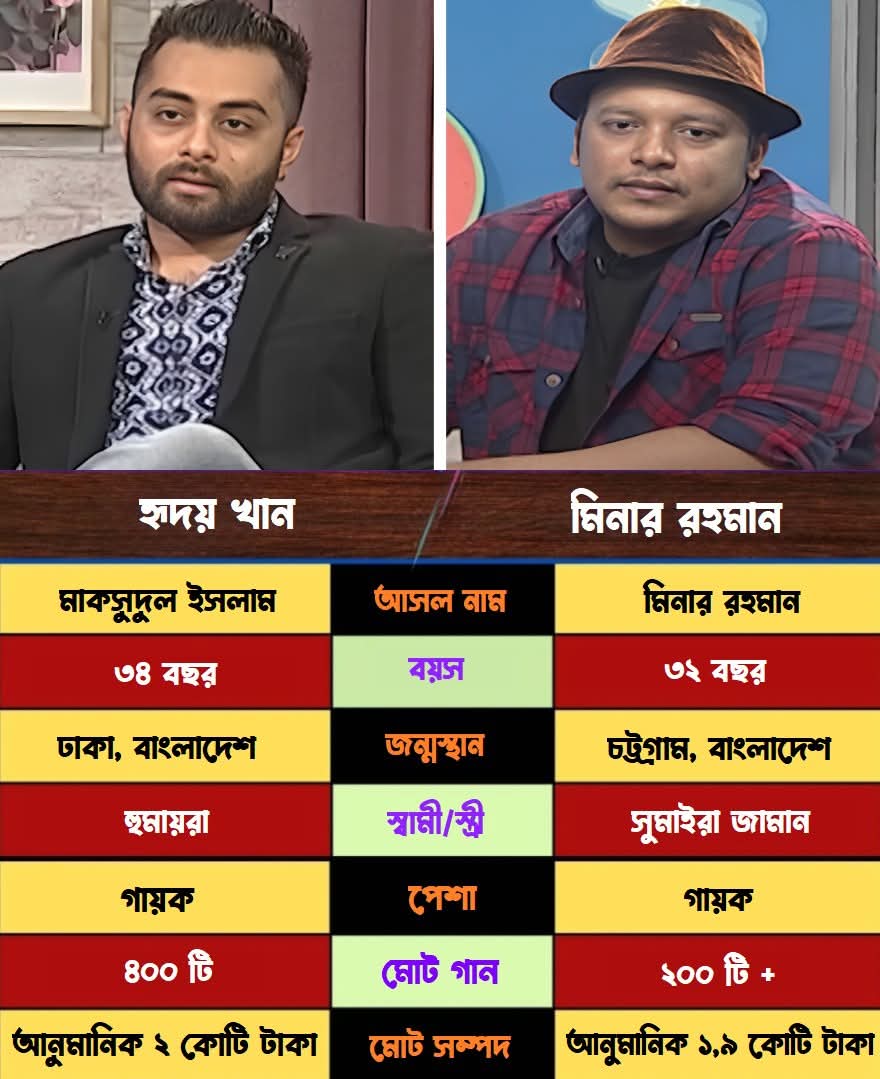 তুলনা করলে দেখা যায়, হৃদয় খান যেখানে চটজলদি জনপ্রিয়তা এবং আধুনিক সুরের গতি দিয়ে মঞ্চ মাতিয়েছেন, মিনার রহমান সেখানে শান্ত মেলোডি এবং গভীর লিরিক্যাল অভিব্যক্তির মাধ্যমে শ্রোতাদের হৃদয়ে স্থায়ী জায়গা করে নিয়েছেন। দু’জনেই তাঁদের স্বতন্ত্র গায়কী দিয়ে বাংলাদেশের সঙ্গীতকে আরও সমৃদ্ধ করেছেন। janas media