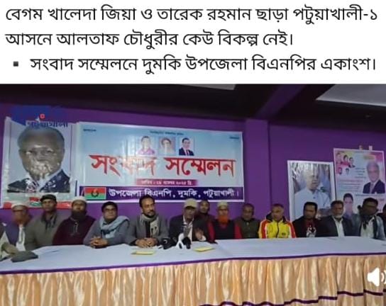 Dumki Upazila BNP has held a press conference to protest against the misleading statement about BNP Vice Chairman former Minister Air Vice Marshal (retd) Alhaj Altaf Hossain Chowdhury. The press conference was held at the temporary office of Upazila BNP, adjacent to Pobiprobi main gate, at 7 pm on Saturday. Upazila BNPMotiur Rahman Dipu read a written statement signed by former acting general secretary and member Md. Jasim Uddin Howladar and former joint convener Md. Motiur Rahman Dipu. He complained that in the press conference organized by Patuakhali district BNP on November 27, false, fabricated and misleading statements were made about BNP nominated candidate of Patuakhali-1 constituency, Alhaj Altaf Hossain Chowdhury. Altaf HossainChowdhury stood by the leaders and activists for 16 years with 25 false cases in mind during the previous fascist Awami League government. Awami terrorist forces attacked his Patuakhali residence numerous times. He spent 19 months in jail along with BNP chairperson Begum Khaleda Zia in 1/11 big pond lie case and 5.5 months in 2024 farce - pre-election conspiratorial lie case.During the previous government, he appeared in court more than 800 times in various false cases.