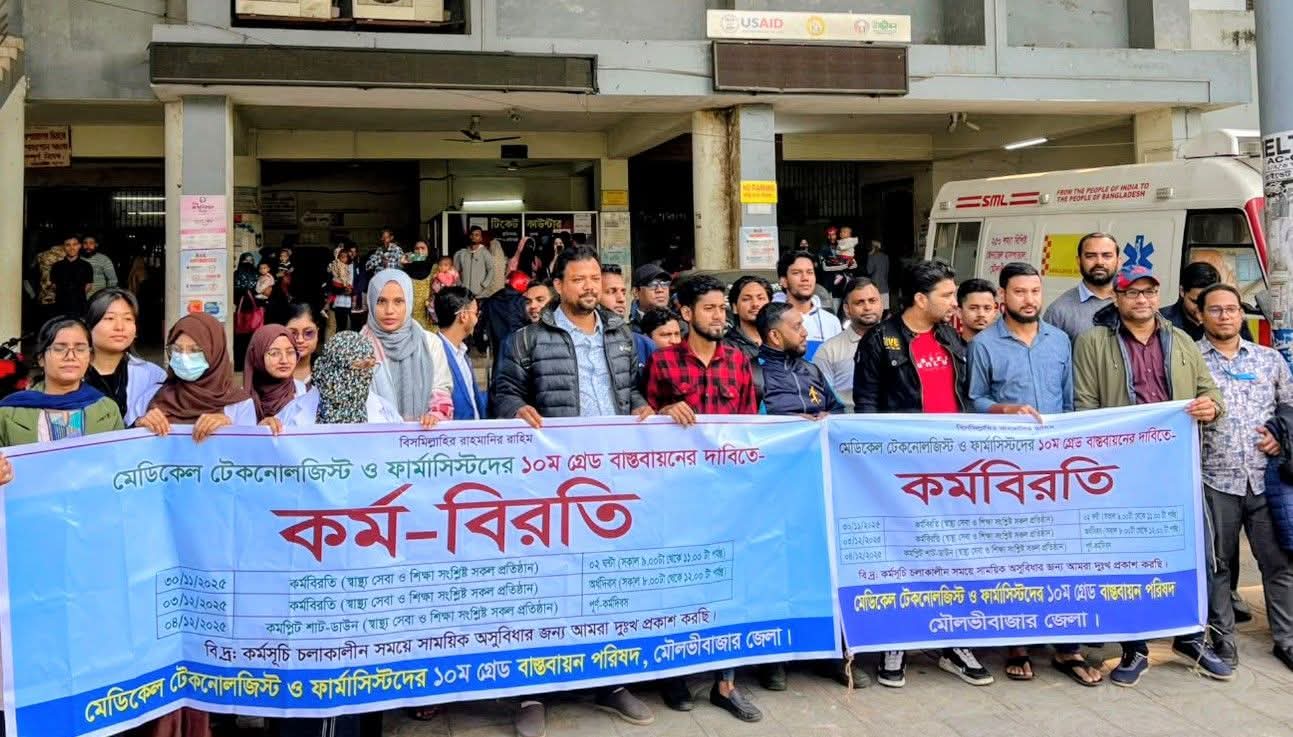 The Medical Technologists and Pharmacists 10th Grade Implementation Council observed a half-day work break on Wednesday (December 3) for the 2nd day to demand the implementation of the 10th grade of medical technologists and pharmacists at Moulvibazar Sadar Hospital. If the demand is not met, all the institutions related to health care and education are completeThe implementation council gave the ultimatum of shut-down.