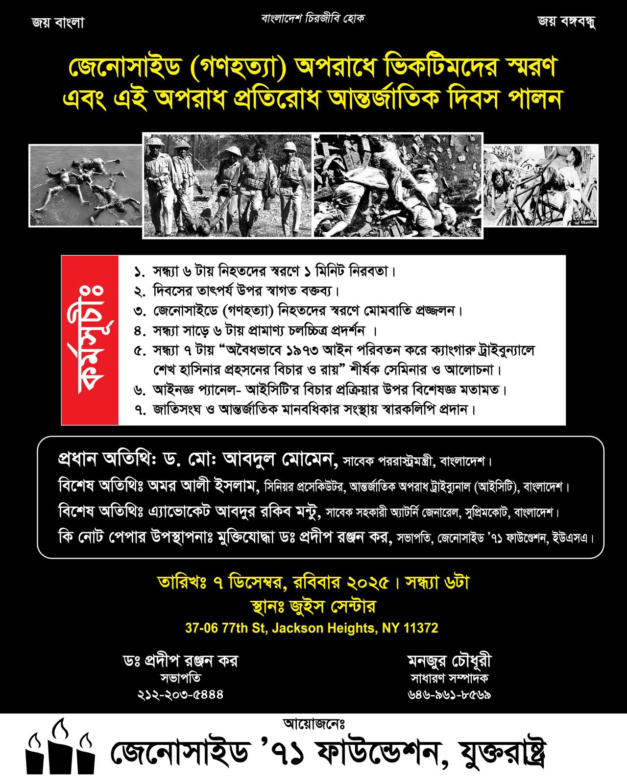 Today, 7 December 2025, Sunday, 6:00 p.m., on the occasion of the international day for the honor and dignity of the victims of the crime of genocide (genocide) declared by the United Nations, various programs have been organized by the initiative of the Genocide ’71 Foundation USA. Khabar Ibn News.