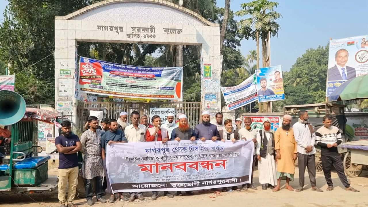 The people of Nagarpur formed a human chain in front of the Nagarpur Government College in Tangail on the morning of December 7, demanding the speedy implementation of the Tangail-Aricha regional road.