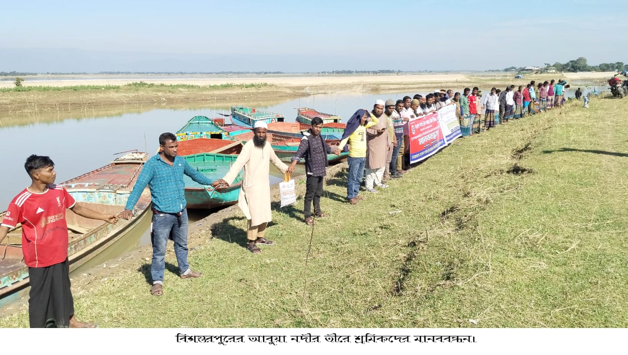 On Wednesday afternoon, Sunamganj District Cargo-Trawler Bulkhead Workers Union and Jamalganj Steel Body Marine Owners Association organized this hour-long human chain program on the banks of Abuya River in Fatepur Union of Biswambharpur Upazila.