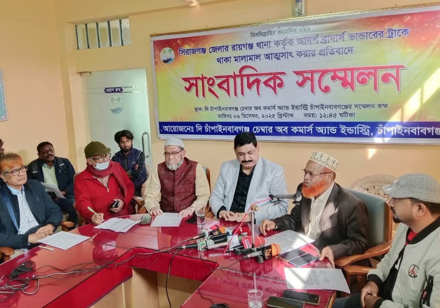(December 6) At 12 noon on Saturday, the organizers held a press conference in the conference room of Chapainawabganj Chamber of Commerce and Industry to protest against the embezzlement of 13950 kg i.e. 75 drums of palm oil of Adarsh Brothers warehouse by Raiganj police station of Sirajganj district.