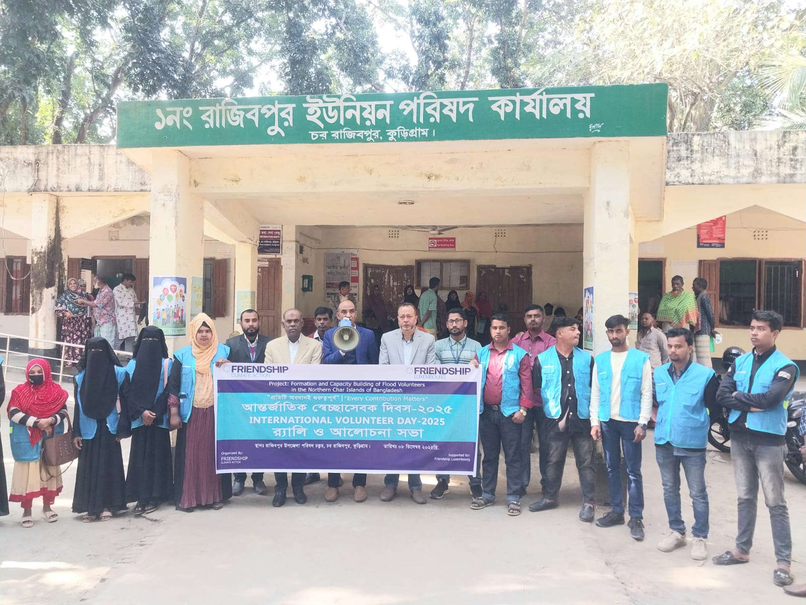 “Every contribution is important” – Keeping this motto in front of Rajibpur Upazila of Kurigram district, the non-governmental development organization Friendship has organized a rally and discussion meeting on the occasion of International Volunteer Day-2025. The rally started from the Union Parishad square at 10:00 am on Monday and circled the main roads of the union.