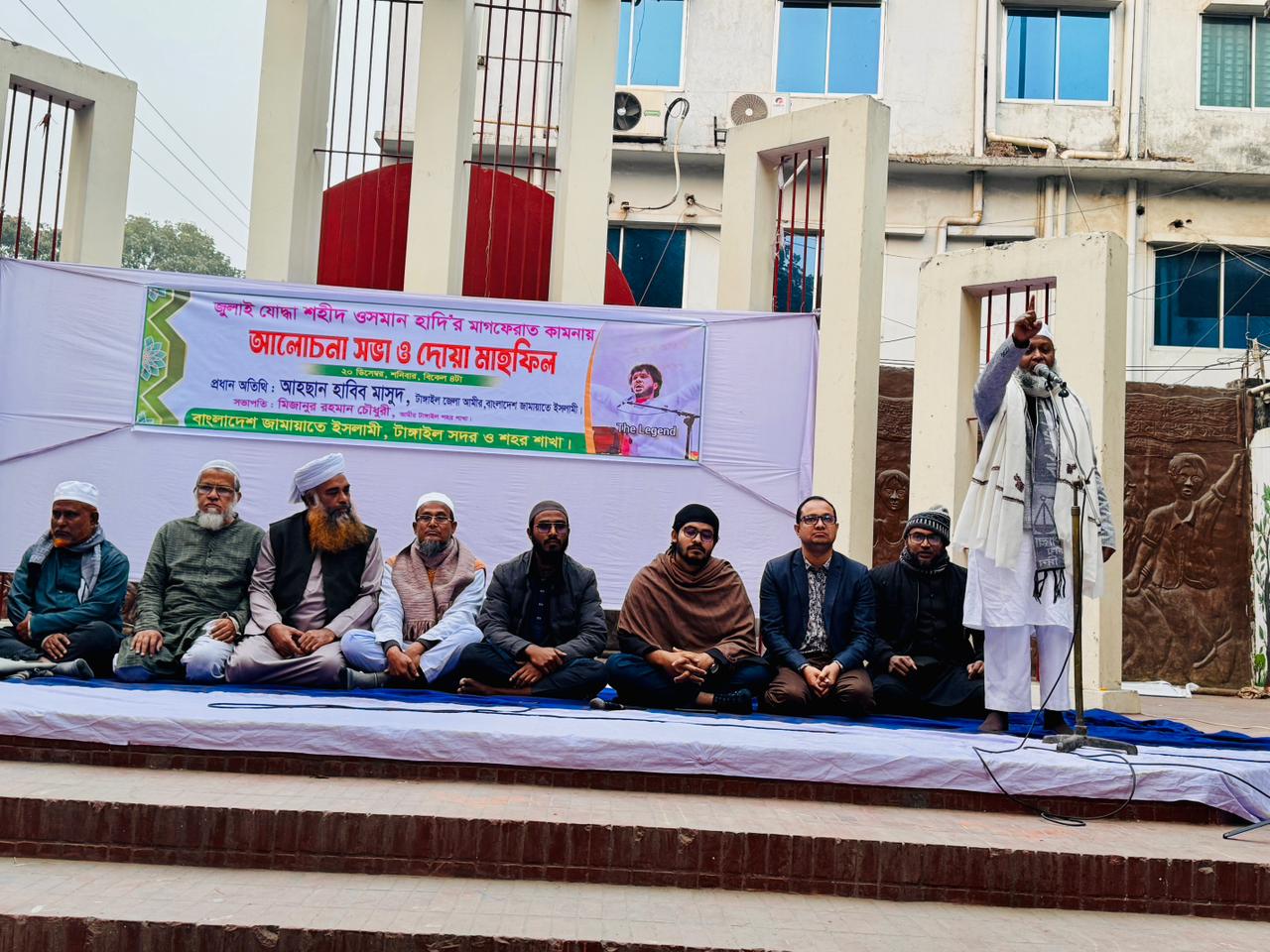 Meanwhile, under the chairmanship of Ameer Professor Mizanur Rahman Chowdhury, Secretary Md. Ameer Ahsan Habib Masud of Tangail District Jamaat spoke as the chief guest under the direction of Saiful Islam. District Organizational Secretary Shahidul Islam, Tangail District President of Islami Chhatrashiverar Mazharul Islam, Sadar Upazila Ameer Professor Iqbal Hossain Badal and others also spoke.District Khilafat Majlis Vice President Mufti Abdur Rahman Madani led the prayer. In his speech, the chief guest demanded exemplary punishment for the killers of Hadi. He also called for bringing the fascism's friends who are lurking inside the government and administration to justice