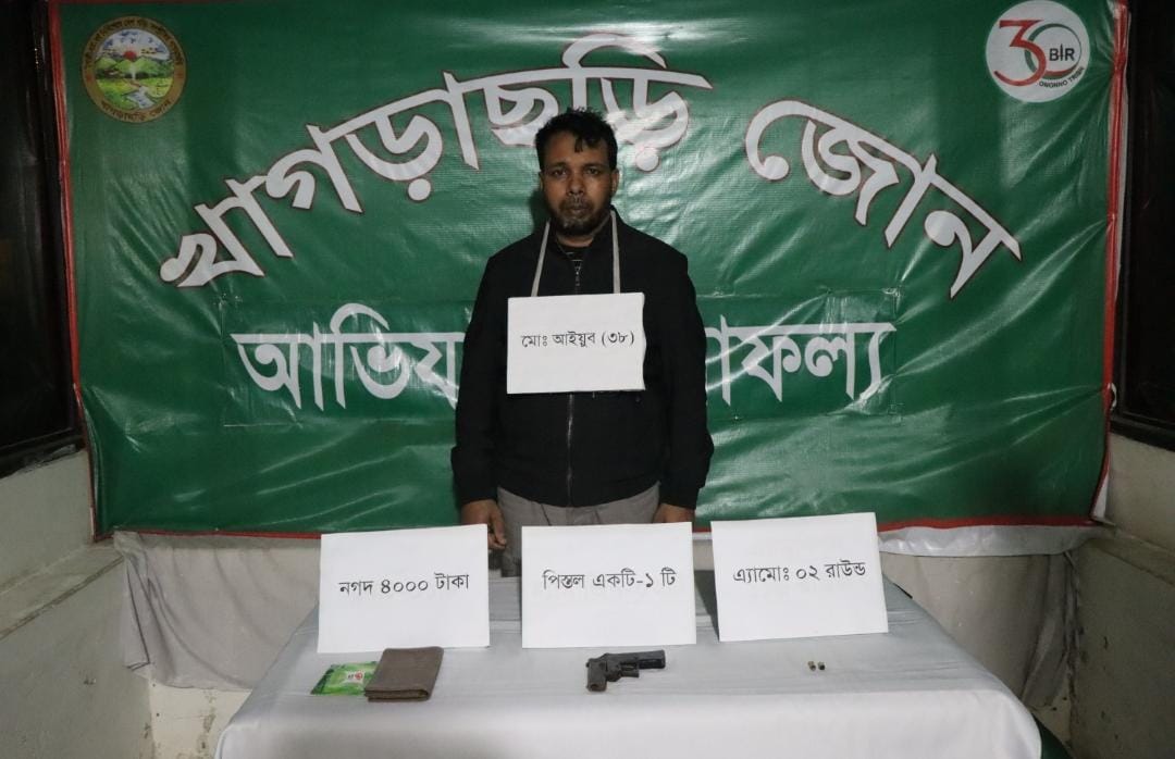 After the arrest, a pistol, a magazine, two rounds of bullets and cash of Tk 4,200 were recovered from him.