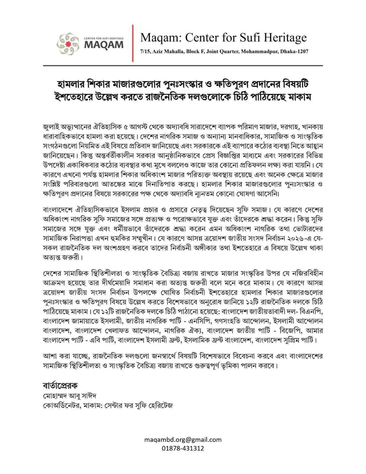 Maqam feels that long-term resolution of the unprecedented attack on shrine culture is essential to maintain the country's social stability and cultural diversity. For this reason, Maqam has sent letters to 12 political parties with a special request to mention the restoration and compensation of the attacked shrines in the election manifesto announced on the occasion of the upcoming 13th National Assembly elections. The 12 political parties to which letters have been sent are: Bangladesh Nationalist Party - BNP, Bangladesh Jamaat Islami, Jatiya Nagiri Party - NCP, Mass Solidarity Movement, Islami Andolan Bangladesh, Bangladesh Khilafat Movement, Nagorik Oikya, Bangladesh National Party - BJP,My Bangladesh Party - AB Party, Bangladesh Islami Front, Islamic Front Bangladesh, Bangladesh Supreme Party.