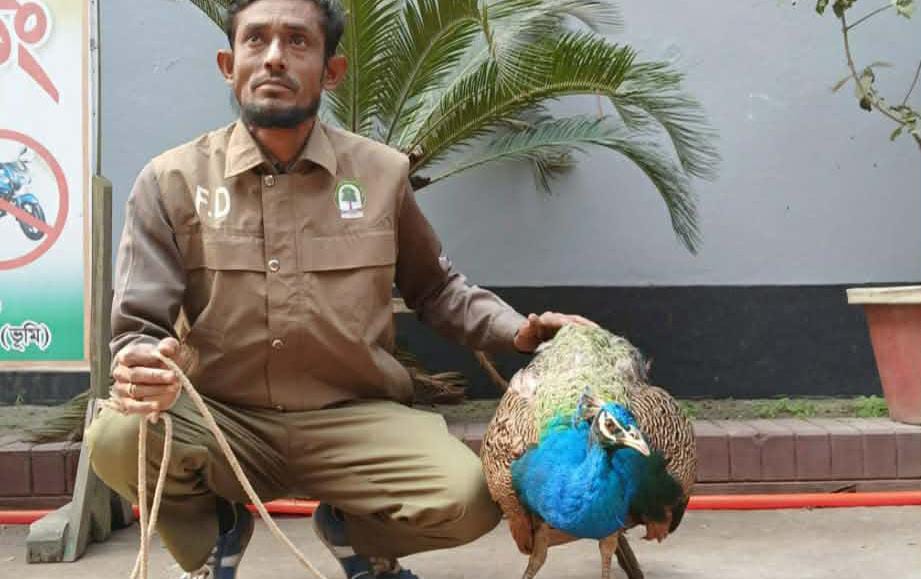 The peacock was recovered from a house in Deldarganj Bazar area of Buraburi Union of Ulipur Upazila on the banks of Brahmaputra river on Sunday morning (January 11).