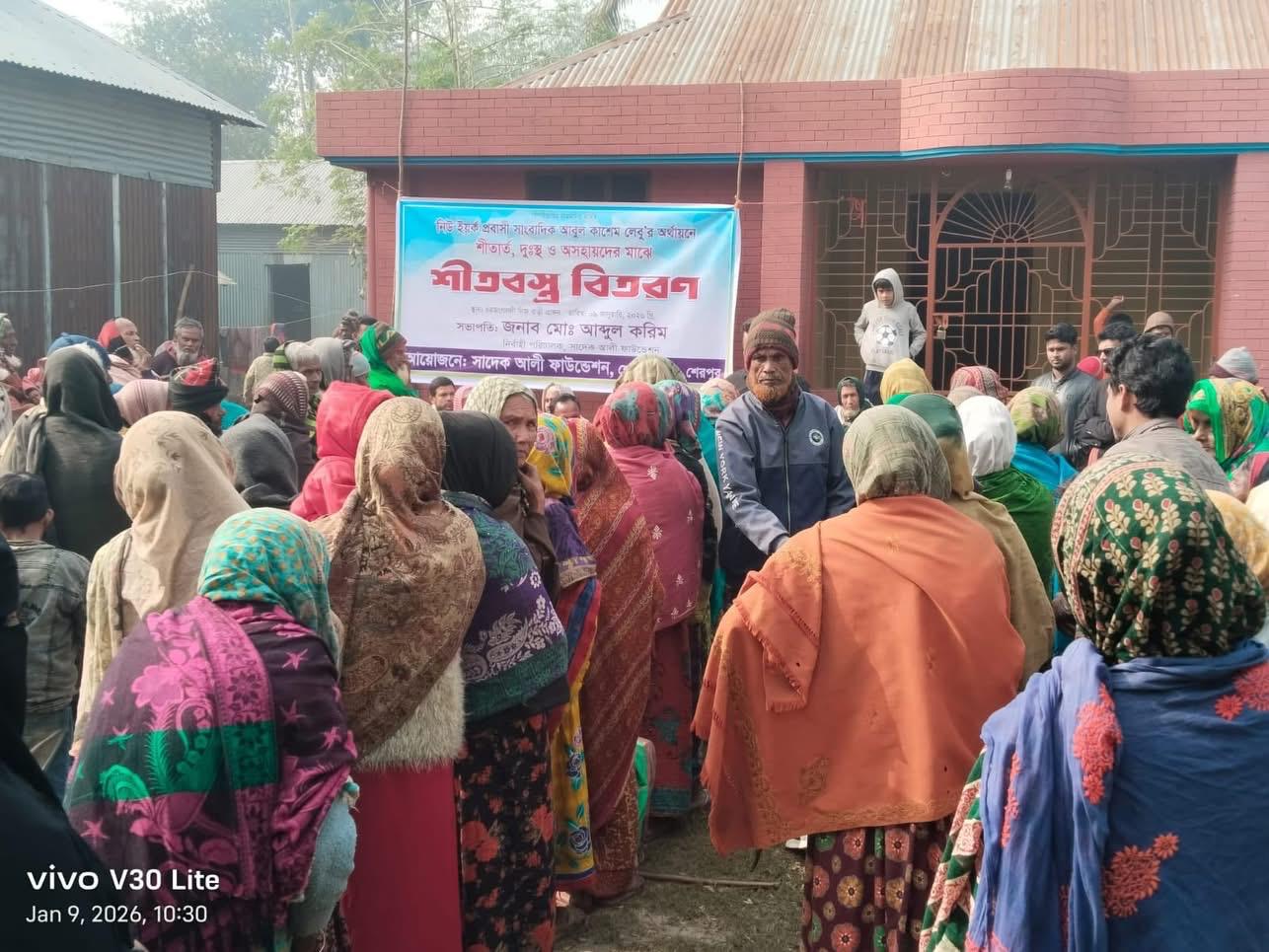 Sadek Ali Foundation gave blankets to poor people in Sherpur. Last Friday, January 9, 2026, winter clothes were distributed among about two hundred poor and helpless people at the home of late Sadek Ali in Char Jangaldi village under Sadar Upazila in Sherpur. At that time, a short discussion meeting was held under the chairmanship of Abdul Karim, Executive Director of Sadek Ali Foundation, under the direction of Khaled Musharraf Jani. Among others, Jamalpur General Post Office Assistant Post Master General Sheikh Farid, Local Ward Member Jabed Ali, Khunua Moulvinagar High School Teacher Saiful Islam, Social Worker Shamim Hossain, and Char Jangaldi Madhya Para Jame Masjid President spoke. Sohag Mia and others. Khabar Ibn News.