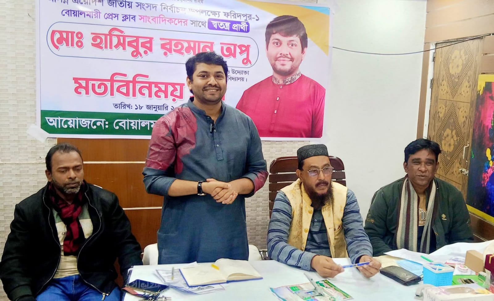 Faridpur District Representative: Hasibur Rahman Apu Thakur, independent MP candidate of Faridpur-1 Constituency, interacted with the members of Boalmari Press Club on Sunday night (January 18) at eight o'clock. An exchange meeting was held at the temporary office of Boalmari Press Club at Al Helal Square. During the exchange of views, he said, I am a child of this township, I am working closely with the common people of this township, I have a soul connection with the common people of the township, I hope that the common people will vote for me and send me to the parliament to speak for them. I will work with people all my life. He also said that there is no chance of rigging the vote, there is no chance of irregularity of the vote, I will not let even a single bird fly over the polling station. The voter will be able to exercise his vote correctly. During this time, the President of Boalmari Press Club Md Rezaul Haque, Vice President Md Murshid Ahmed Litu Sikder, General Secretary Muhabbat Jan Chowdhury, Finance Secretary Taibur Rahman Kishore, the members were Md Mizanur Rahman Mizan Mridha, Md Elias Molla, Md Jahangir Hossain, Md Russell Mia, Md Tarek Abdullah, Md:Azizul and many others.