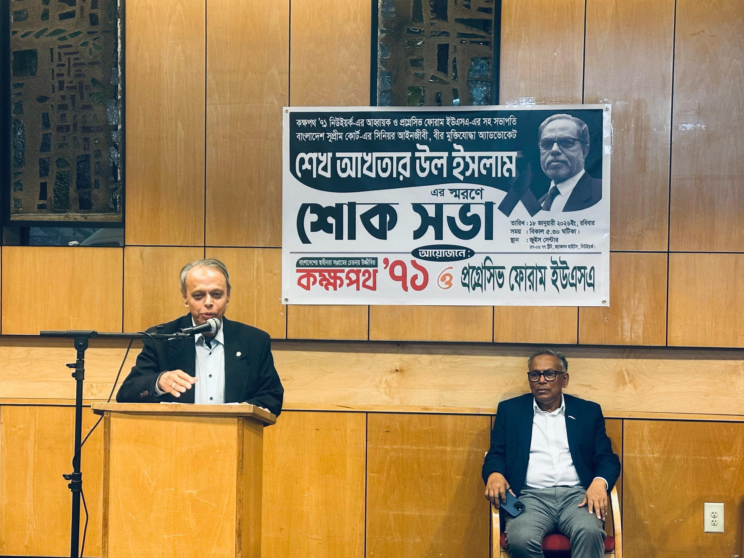 On January 18, 2026 at the Juice Center in Jackson Heights, New York, at 7 pm Orbit”71 New York and Progressive Forum USA organized a memorial service in memory of veteran freedom fighter advocate Sheikh Aktar Ul Islam. The condolence meeting was presided over by former president of Progressive Forum Vir Muktijobdha Khorshed Ul Islam and moderated by Orbit”71 New York. Convener Advocate Mia H Zakir. At the beginning of the meeting, 1 minute silence was observed in honor of late Advocate Sheikh Aktar ul Islam. General Secretary of Progressive Forum USA Zakir Hossain Bachchu and Member Secretary of Orbit-71 New York Advocate Jayjit Acharya gave welcome speech. Freedom fighters, lawyers, journalists and leaders of various organizations were present in the mourning meeting. Vir Muktijobdha Ismail Ansari, President of Bangladesh Law Society USA Bir Muktijobdha Advocate M. Matiur Rahman, Senior Journalist and Orbit-71 Advisor Hakikul Islam Khokon, Former President of Bangladesh Law Society USA Advocate Mohammad Ali Babul, Mithun Ahmed, Former Editor of Bangladesh Law Society USA General Advocate Syed as guests in the condolence meeting. Moin Uddin Junel, Udichi General Secretary Kallol Das, Mahila Parishad General Secretary Sulekha Pal, Bangladesh Law Society USA Former Joint General Secretary Advocate Mohammad Saidur Rahman, Progressive Forum Joint Secretary Aleem Uddin, Dr. Azizul Haque, Victor Elahi Liaquat, Dr. Obaid Ullah Mamun, Kalphoom Khandgir, MA Karim. Jahangir, late Sheikh Akhtar ul Islam’s younger brother Sheikh Atiqul Islam, Al Amin Babu, journalist Uttam Kumar Saha etc. Bangladesh Law Society USA Treasurer Advocate Mahbub Alam, Munmun Saha, Journalist Sohel Chowdhury and Muzharul Islam Chowdhury Mucha were present in the condolence meeting among others. The speakers in their speech paid tribute to the various memories of the late Advocate Sheikh Akhtar ul Islam and for his organizational activities, he will remain inexhaustible to all.This heroic freedom fighter and senior lawyer of the nation will always be remembered for his many contributions to the country and society. Imam Qayyum led prayers for the late Sheikh Akhtar ul Islam in the mourning meeting.